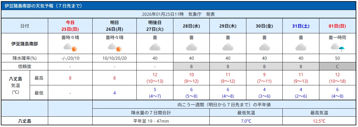 これからの時期の八丈島は強い季節風が吹くことが多いです。 風が吹くと体感気温が下がりますのでこの気温より更に暖かい服装をしてきてくださいね!!